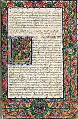 ![]() First page from the editio princeps of the Naturalis historia, printed in 1469 in Venice by Johann of Speyer. Bibliothèque nationale de France. | |