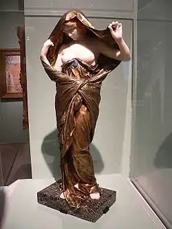 Nature Unveiling Herself Before Science (La Nature se dévoilant à la Science) is an allegorical sculpture created in 1899 in the Art Nouveau style by Louis-Ernest Barrias. The sculpture depicts a woman—personifying Nature—removing a veil to reveal her face and bare breasts. The sculpture, which is in the Musée d'Orsay, was commissioned for the Conservatoire National des Arts et Métiers.[1] Underneath the veil, Nature wears a gown held up by a scarab. The figure is made of marble, with the gown made of Algerian onyx, and the scarab of malachite. The sculpture has also been reproduced in other media.