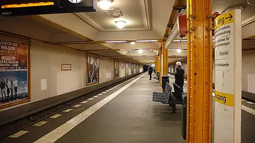 The station was opened on 30 January 1923 as Stettiner Bahnhof after the then nearby long-distance station Stettiner Bahnhof. It is located 4.6 meters below Chausseestraße at the intersection of Chausseestraße and Invalidenstraße. It was built in 1913–14 and modified after 1919 by Alfred Grenander and Alfred Fehse, following the plans of Heinrich Jennen. Both developed a white station with a central platform; the station signs bore a yellow border. The BVG uses the abbreviation Zw for the station.[2] The station has disabled access via a lift ascending to Invalidenstraße.