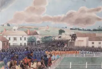 The Nauvoo Legion would sometimes perform theatrical military displays to garner local support.[8] On May 7, 1842 the Nauvoo Legion mustered as part of a “Programme Militaire.”[8] They performed a sham battle and Joseph Smith gave an address.[8] Special guests, including Judge Stephen A. Douglas, attended and were invited to Smith's home for dinner.[8] This event marked a breaking point in the strained relationship between Joseph Smith and John C. Bennett.[8][11]
