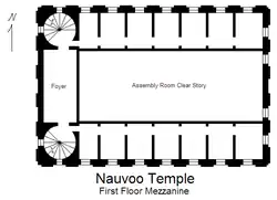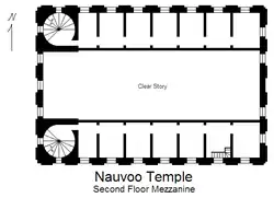 The basement was accessed by spiral staircases at the northwest and southwest corners of the temple. The staircase landing was made of wood and opened to a short hallway heading east, leading to the basement proper. Between the two hallways was an unfinished room sealed off from the rest of the temple, containing an old well that had been dug but never used. The room was discovered by an anti-Mormon mob who broke through the floor of the vestibule above.[12]