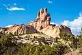 Navajo Church is part of the Zuñi Mountains.[1] The landmark is located seven miles (11 km) east-northeast of Gallup and 1.5 miles (2.4 km) north of the town of Church Rock, which is named after the landform. Topographic relief is modest as the summit rises 550 feet (168 meters) above Red Rock State Park in 0.6 mile (1 km). A 2.2 mile (round-trip) hiking trail leads to, and around, the base of the spires.[5] Precipitation runoff from the mountain drains to the Puerco River. Navajo Church is a sacred place to the Navajo people.[6] This landform's toponym has been officially adopted by the United States Board on Geographic Names.[3]
