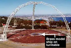 As one of its first projects, NEL began building its Shipboard Antenna Model Range. The non-metallic arch of this structure supports a transmitting antenna which is positioned toward a brass model ship on a turntable. The ground plane under the arch simulates the electrical characteristics of the ocean, allowing research on the properties of shipboard antennas to be carried out.[5]