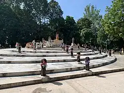 The Navel City Pillar is atop Doi Chom Thong (Chom Thong Hill) on the grounds of Wat Phra That Doi Chom Thong. The main pillar and 108 surrounding pillars were constructed in Khmer style "Banom Ba-Keang" based on Lanna beliefs. The outside area symbolises river and land, the inner part the six tiers of the heavens (Catummaharajika, Tavatimsa, Yama, Tusita, Nimmanarati, and Paranimmitavasavatti) which are divided by the five important rivers of ancient legend (Ganges, Yamuna, Ajiravati, Sarabhu, and Mahi). The platform of the main pillar is made of marble which is divided into three tiers to symbolise the Rupabrahma, Arupabrahma, and Nirvana. The main pillar is on a triangular base.