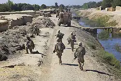 In mid-May 2010 1st Battalion 3rd Battalion was substituted by 3rd Battalion, 3rd Marines.[29] Partnering with Afghan National Army soldiers from the 215th Corps, the battalion found itself in an area awash with money as the U.S. Agency for International Development was in the process of spending $30 million in an attempt to increase agricultural production (and create jobs for thousands of otherwise-potential Taliban recruits), but was also resulting in tensions between the local community council and tribal elders.[30][31] In-mid June, Lima Company took part in Operation New Dawn, establishing observation posts in southern Shorshork, an area in between Nawa and Marjeh.[32] In late July, the battalion suffered the loss of Corporal Joe Wrighstman, who drowned in the Helmand River while attempting to save the life of an Afghan National policeman.[33] Just days later they had to secure the crash site of Dealer 54, an HMLA-369 helicopter which had crashed near Lashkar Gah, killing the two pilots.[34][35][36] Around this time, India Company conducted Operation Thresher and later Operation Mako in areas of Nawa District under heavy Taliban influence, finding several cache sites and taking some detainees.[31][36] In September, while providing pre-election security for the Afghan parliamentary elections the battalion suffered another loss when 1st Lieutenant Scott Fleming was shot and killed.[37] Nevertheless, on election day Nawa District was the one location in Helmand Province with no reported Taliban attacks. Residents claimed that the Marines from 3rd Battalion had implemented good security measures and encouraged the people to cooperate with the government, preventing the Taliban from firing a single shot.[38] By the end of 3rd Battalion's deployment in the fall of 2010, Nawa was regarded by many as "a model of counterinsurgency operations and the most stable district" in southern Afghanistan.[39][40] The success of 3rd Battalion, 3rd Marines redirected OEF's focus to the hostile Nawa-I-Barakzayi District and the city of Marjah.