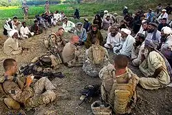 In November 2009, 1/5 was replaced by 1st Battalion, 3rd Marines.[16][17] In the late summer and early fall the Marines detained Haji Adam, one of Nawa's main drug lords, and turned his house into Combat Outpost (COP) Sullivan.[18] In November two local officials were assassinated.[19] On December 17, 2009, Admiral Mike Mullen, the Chairman of the Joint Chiefs of Staff, visited Patrol Base Jaker and touted the security gains by touring the Nawa district center without wearing body armor.[20] Several weeks later Afghan President Hamid Karzai and ISAF commander General Stanley McChrystal also visited Nawa on January 2, 2010.[2]