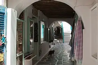 Bourgos (Greek: Μπούργος) is the name of the district north of the castle. Traditionally, it was inhabited by the city's merchants and artisans, and, in general, by a 'middle class' of people whose main occupation was not agriculture.[11] The name comes from the Venetian word borgo, which refers to a kind of fortified settlement. This part of the city was lightly fortified and only accessible by three gates. The houses are built very close to each other, with the streets being very narrow and winding, with a lot of dead ends. This layout is often likened to a labyrinth, and it is believed that it was built this way in part to disorientate any intruders, most notably pirates.[11] All roads going in or out of Bourgos eventually lead to the castle or towards the sea.[11] The area has a high density of churches,[13] some small squares, arched passageways, and white houses, following the typical Cycladic architecture.[13] Right next to Bourgos, outside one of the gates, there is the neighborhood of Evriaki (Greek: Εβριακή, meaning 'Jewish'), which used to be the city's Jewish quarter.
