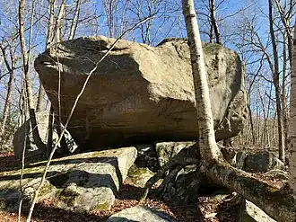 ![]() Large Erratic Boulder and unusual tree bough near the start of the Nayantaquit Trail loop in Nehantic State Park's western block. | |