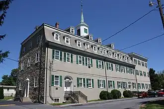 Nazareth Hall is a colonial mansion built in 1756, and is a solid masonry building with a gambrel roof measuring 100 feet (30 m) long and 46 feet (14 m) deep. The 1840 Moravian Church is a 2-1/2-story stucco coated stone building with a gable roof. The Parsonage was built in the 1870s and is a three-story brick structure. The original section of the "First Room" Building was built in 1850, with additions and modifications made in 1855, 1875, and the 1920s. The Principal's House is a two-story building built in 1819, with additions and modifications made in the 1870s and in 1910. The Single Sister's House was built in 1784, and is a three-story building with a single pitched roof. It was converted for school use in 1874–1875.[2]