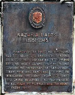 Nazaria Lagos[1] (August 28, 1851 – January 27, 1945[2]) was a nurse in the Revolution in the Philippine–American War. She was known as the Florence Nightingale of Panay, as she provided medical treatment to combatants and civilians.[3]