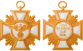 The twenty-five year service medal was the first class award. It was of the same design as the 2nd class award, but gold plate replaced the silver plate with white enamel on the arms of the four-pointed cross and for the center section inside of the oak leaf wreath. The reverse side inscription was white enamel with gold lettering. The ribbon was 30mm and in red with the edge stripes being white and having a small gold centre stripe. This grade was on occasion awarded posthumously.[1][5][6]