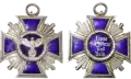 It had the same design as the 3rd class award, but for cast being plated in silver, with dark blue enamel on the arms of the four-pointed cross and for the center section inside of the oak leaf wreath. The reverse side inscription was blue enamel with silver lettering. The 30mm ribbon was blue with two narrow silver-gray side stripes.[1][4][5]