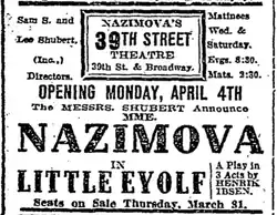 In 1906 the theatrical entrepreneur Lee Shubert had presented Alla Nazimova in matinee performances of three Ibsen plays and was reportedly "bewitched" by the beautiful Russian actress. Hoping to become a major producer of serious drama in New York and to continue promoting Nazimova, he built a new theatre on 39th Street and Broadway which he named Nazimova's 39th Street Theatre. After a two-week delay from the announced date of April 4, 1910, the theatre finally opened on April 18 with Nazimova starring as Rita Allmers in Ibsen's Little Eyolf. While her acting was praised by the critics, the play was not. The New York Times, pronounced it "peculiar" and The Evening Post termed it "dreary, unprofitable, and obnoxious."[2][3]