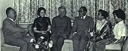 In foreign affairs, Ne Win followed a strictly neutralist policy during the Cold War, participating in the Non-Aligned Movement and keeping his distance from both the United States and the Soviet Union.[13] On the other hand, his relations with Mao Zedong and the People's Republic of China were initially excellent, but were temporarily broken between 1967 and 1971, due to Mao's covert support for the Communist insurgency within Burma and the outbreak of anti-Chinese riots by regime supporters; however, in March 1971 relations were fully restored and Chinese economic aid continued.[14]