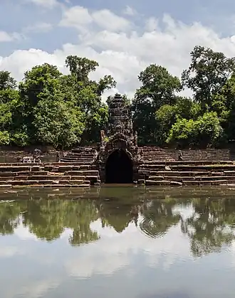 Neak Pean (or Neak Poan) [2] (Khmer: ប្រាសាទនាគព័ន្ធ, "the entwined serpents") at Angkor, Cambodia is an artificial island with a Mahayana Buddhist temple on a circular island in Jayatataka Baray, which was associated with Preah Khan temple, built during the reign of King Jayavarman VII.[3]: 389 It is the "Mebon" of the Preah Khan baray (the "Jayatataka" of the inscription).[4]
