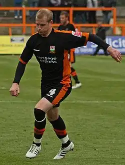 He signed for League Two club Barnet in June 2007 on a free transfer as he was out of contract with York.[24] He said he decided to join Barnet so he could fulfil a lifelong ambition of playing in the Football League.[25] He made his debut against Morecambe on 11 August 2007 and was sent off for violent conduct in his second match against Norwich City in the League Cup on 14 August 2007,[26][27] which resulted in a three-match suspension.[28] He finished the 2007–08 season with 47 appearances and two goals for Barnet,[29] and handed in a transfer request in April 2008 after turning down an improved contract with the club.[30] Despite this, the club exercised their option to extend his contract for another season in May.[31] He was removed from the transfer list at his own request after the start of the 2008–09 season.[32]