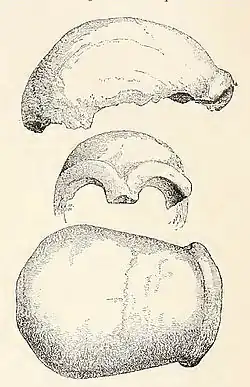The discovery came to the attention of the cave's owner, Wilhelm Beckershoff, who assumed the bones belonged to a cave bear. Beckershoff, along with quarry co-owner Friedrich Wilhelm Pieper,[3] retrieved 16 bones and fragments from the rubble and handed them to Elberfeld teacher and fossil collector Johann Carl Fuhlrott. Among the preserved remains were a skullcap with a fragment of the left temporal bone, a fragment of the right scapula, a right clavicle, both humeri (with the right side intact), a complete right radius, fragments of the right and left forearm bones, five ribs, an almost complete left half of the pelvis, and both femora.[4]
