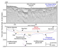 Seismic reflection is used for imaging of nearly horizontal layers in the Earth. The method is much like echo sounding. It can be used to identify folding and faulting, and to search for oil and gas fields. On a regional scale, profiles can be combined to get sequence stratigraphy, making it possible to date sedimentary layers and identify eustatic sea level rise.[7]