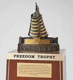 Big Ten realignment in 2014 placed NU and UW in the West Division, the same year the schools announced the creation of the Freedom Trophy to be presented to the winner of the annual meeting.[1] The trophy is made of bronze and features images of both teams' stadiums with an American flag in the center.[1] Half of the trophy is the east side of Memorial Stadium and half is the north side of Camp Randall Stadium.[1]