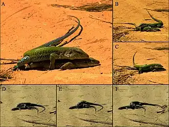 Necrophilia has been documented in various lizard species, including Ameiva ameiva,[32][50] the leopard lizard,[51] and Holbrookia maculata.[52] There are two reports of necrophilic behavior in the sleepy lizard (Tiliqua rugosa). In one, the partner of a male lizard got caught in a fencing wire and died. The male continued to display courtship behavior towards his partner two days after her death. This lizard's necrophilia was believed to stem from its strong monogamous bond.[53] In one study of black and white tegu lizards, two different males were observed attempting to court and copulate with a single female corpse on two consecutive days. On the first day, the corpse was freshly dead, but by the second day, it was bloating and emitting a strong putrid odor. The researcher attributed the behavior to sex pheromones still acting on the carcass.[30]
