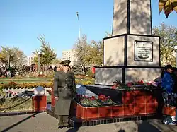 An honour guard at the tomb for those killed during the test R-16 on 24 October 1960, the city of Baikonur