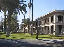 At first it was a tent town for railroad construction crews, but the railway would eventually build a hotel, car sheds, shops and a roundhouse. Within only a month, Needles would have a Chinese laundry, a newsstand, a restaurant, several general stores, and nine or ten saloons. Needles quickly became the largest port on the river above Yuma, Arizona.[8]: 82 The railway and the Fred Harvey Company built the elegant Neoclassical and Beaux-Arts style El Garces Hotel and Santa Fe Station in 1908, which was considered the "crown jewel" of the entire Fred Harvey chain.[7] The landmark building is on the National Register of Historic Places and is being restored.