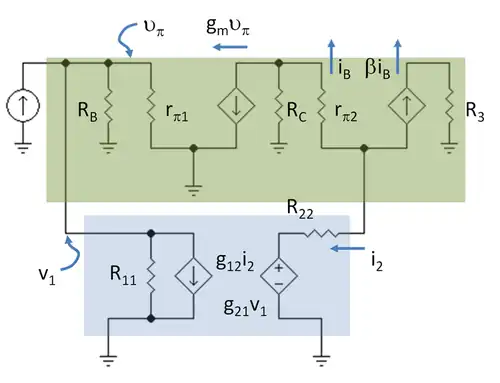 The next step is to draw the small-signal schematic for the amplifier with the two-port in place using the hybrid-pi model for the transistors. Figure 5 shows the schematic with notation R3 = RC2 || RL and R11 = 1 / g11, R22 = g22.