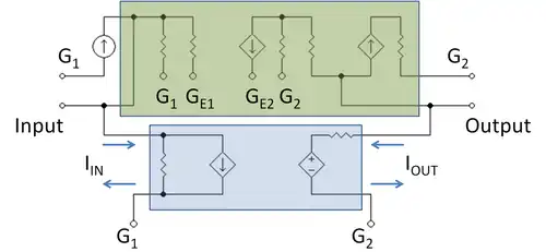 For example, for a current-feedback amplifier, current from the output is sampled for feedback and combined with current at the input. Therefore, the feedback ideally is performed using an (output) current-controlled current source (CCCS), and its imperfect realization using a two-port network also must incorporate a CCCS, that is, the appropriate choice for feedback network is a g-parameter two-port. Here the two-port method used in most textbooks is presented,[31][32][33][34] using the circuit treated in the article on asymptotic gain model.