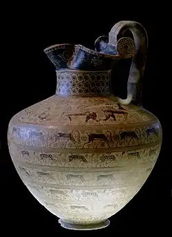 Negative painting (or lost color[1]) is a painting technique where the background is painted dark, allowing the lighter color to appear as the design. There have been at least four methods proposed as to how negative painting was done.[2] It is widely found on painted pottery, but it is speculated that “the first objects with negative painting may not have been pottery, but rather textiles or gourds.”[3]