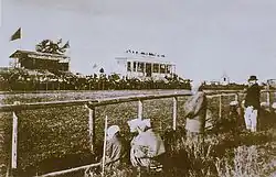 The completion of the Negishi Racecourse in 1866 provided the first permanent site for horse racing in Yokohama, replacing a temporary Swamp Ground site at the rear of the Kannai foreign settlement where the first races had been run in 1862.[1] Initially intended as an entertainment venue for the foreign community, the racecourse rapidly became popular with Japanese society; the Emperor Meiji visiting on 14 separate occasions.[2]
