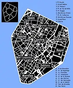 The origins of Brussels can be traced back to the heart of Saint-Géry/Sint-Goriks Island, formed by the river Senne, on which a first keep was built around 979. Nowadays, the neighbourhood around the Halles Saint-Géry/Sint-Gorikshallen, a former covered market, is one of the capital's trendiest districts.[2] In this Central Quarter (French: Quartier du Centre, Dutch: Centrumwijk), there are some vestiges of the 13th-century first walls of Brussels, which encompassed the area between the first port on the Senne, the old Romanesque church (later replaced by the Brabantine Gothic Cathedral of St. Michael and St. Gudula),[3] and the former ducal palace of Coudenberg in today's Royal Quarter. At the centre of this triangle are the Grand-Place/Grote Markt (Brussels' main square);[4] the Îlot Sacré district, which takes its name from its resistance to demolition projects, itself crossed by the Royal Saint-Hubert Galleries;[5] the Saint-Jacques/Sint-Jacobs district, which welcomed pilgrims on their way to Santiago de Compostela; as well as the former Brussels Stock Exchange building, erected on the site of a former Franciscan convent whose remains have been unearthed.[6][7]