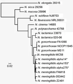 The genomes of at least 10 Neisseria species have been completely sequenced.[3] The best-studied species are N. meningitidis with more than 70 strains and N. gonorrhoeae with at least 10 strains completely sequenced. Other complete genomes are available for N. elongata, N. lactamica,[7] and N. weaveri. Whole genome shotgun sequences are available for hundreds of other species and strains.[8] N. meningitidis encodes 2,440 to 2,854 proteins while N. gonorrhoeae encodes from 2,603 to 2,871 proteins. N. weaveri (strain NCTC 13585) has the smallest known genome with only 2,060 encoded proteins[9] although N. meningitidis MC58 has been reported to have only 2049 genes.[3] The genomes are generally quite similar. For example, when the genome of N. gonorrhoeae (strain FA1090) is compared to that of N. meningitidis (strain H44/76) 68% of their genes are shared.[8]