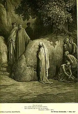 Nella appears in a conversation between Dante and Forese Donati in Canto 23 of Purgatorio in Dante Alighieri's Divine Comedy. She is mentioned after Dante learns that his gluttonous friend Forese has somehow advanced very far in Purgatory. Dante is surprised at this and asks how he could be so high up in Purgatory, as he has only recently died. Forese explains to him that he was only able to get so far because of his righteous wife, Nella. Here we learn that she has been weeping and praying for Forese, and that these good works helped him move through Purgatory much more quickly than he could have alone. Since she has kept his name alive on earth, and prayed to God for him so often, he has spent less than four years in the lower levels of Purgatory. Now he is at the Terrace of Gluttony.[11]