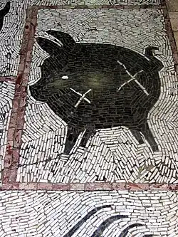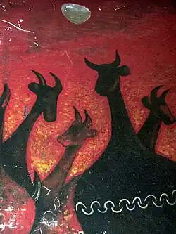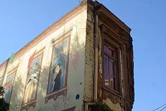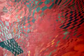 In even worse conditions is Quinchamalí (1958) at the Juan Esteban Montero Gallery: the paint of the mural is peeling and warping due to the humidity. The art restorer Carolina Broschek maintains that the mural can be saved, but the owner of the building on which it is painted, Yusif Tala, opined that the Nemesio Antúnez Foundation should take care of the painting or move it to another place, as has no interest in preserving it.[2] In the same gallery, besides the mural, Antúnez installed floor mosaics which are still in perfect condition.