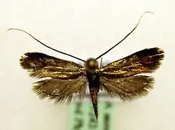 The wingspan is 12–16 millimetres (0.47–0.63 in). The head is ferruginous, forehead in male black. The antennae in male with basal l/8 clothed with rough scales above, in female gradually thickened towards base. The forewings are shining golden - bronze, usually more coppery posteriorly with sometimes a faintly indicated darker postmedian fascia. Hindwings dark purplish-fuscous.[2] [3][4][5] [6]