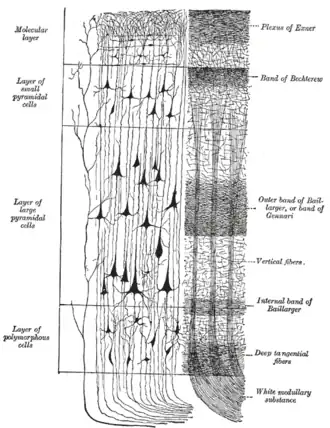 ![]() A representative column of neocortex. Cell body layers are labeled on the left, and fiber layers are labeled on the right. | |