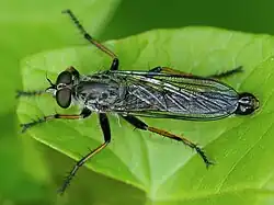 Neomochtherus geniculatus can reach a body length of about 9–20 millimetres (0.35–0.79 in).[3][4][5] These robber flies have a small facial gibbosity with a few bristles forming the mystax. Sternites are predominantly shiny. Femora are black. The widest point of the distinctly broadened hypopygium is in the middle.[6]