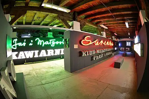 The oldest neon sign is probably located at the Warszawa Stadion train station.[7][8] The museum acquired, among others, the neon signs of the restaurants "Shanghai" and "Ambasador", the café "Jaś i Małgosia" and the cooperative trading house "Sezam".[9]