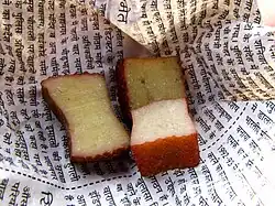 At the festival of Yomari Purnima celebrated in December, to thank the goddess of grains Annapurna after the harvest, the Newar make sweet dumplings (yomari) with rice flour filled with sesame seeds, and brown sugar or molasses. In the predominately Hindu country, sweet peda made with thickened milk (khuwaa) are offered to the Hindu gods.[27]