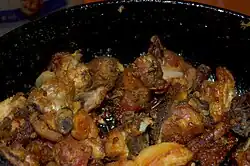 Taro root is an important crop in the region. The leaves and roots are eaten. Sidhara[22] is a mixture of taro root, dried fish and turmeric that is formed into cakes and dried for preservation. The cakes are broken up and cooked with radish, chili, garlic and other spices to accompany boiled rice. Snails are cleansed, boiled and spiced to make ghonghi.[23][24] Another short compendium of Tharu recipes[25] includes roasted crab, wheat flatbread fried in mustard oil, and fried taro leaf cakes.[26]