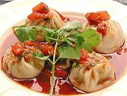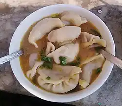 Momo is a Himalayan dumpling, filled with minced meat in a flour dough, given different shapes and then cooked by steaming.[3] It is one of the most popular foods in Nepal and the regions of Sikkim, Darjeeling and Kalimpong in India where Nepali-speaking Indians have a presence. Momo were originally filled with buffalo meat but are now commonly filled with goat or chicken, as well as vegetarian preparations. Special foods such as sel roti, finni roti and patre are eaten during festivals such as Tihar. Sel roti is a traditional Nepali homemade ring-shaped rice bread which is sweet to taste. Other foods have hybrid Tibetan and Indian influence.
