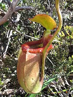 The pitchers of N. × kinabaluensis may be quite large, but do not compare to those of N. rajah or N. × alisaputrana (N. burbidgeae × N. rajah). Nepenthes × kinabaluensis can only be found on Mount Kinabalu (hence the name) and nearby Mount Tambuyukon, where the two parent species occur sympatrically.[8] More specifically, plants are known from a footpath near Paka Cave and several places along an unestablished route on a south-east ridge, which lies on the west side of the Upper Kolopis River.[5] The only accessible location from which this hybrid is known is the Kinabalu summit trail, between Layang-Layang and the helipad, where it grows at about 2,900 m in a clearing dominated by Dacrydium gibbsiae and Leptospermum recurvum trees. Nepenthes × kinabaluensis has an altitudinal distribution of 2,420 to 3,030 m.[9] It grows in open areas in cloud forest.