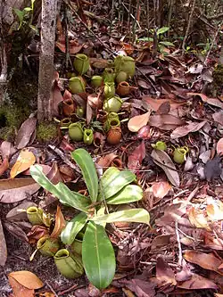 Nepenthes ampullaria, unlike other members of its genus, has evolved away from carnivory and the plants are partly detritivores, collecting and digesting falling leaf litter in their pitchers.[7][8][9]