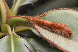 The specific epithet erucoides, formed from the Latin eruca (caterpillar) and Greek -oides (resembling), refers to the densely hairy developing leaves, but particularly the tendrils, which are said to resemble the "exuberantly hairy caterpillars of certain erebid macromoths from the subfamily Arctiinae, such as those of the genus Arctia".[1] The description describes this species as having perhaps the densest indumentum of any Nepenthes in its emerging foliage, but notes that this hair is rapidly dropped as the leaves develop.[1]