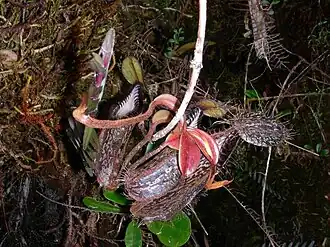 Rosette and lower pitchers are only produced for a short time before the plant transitions into a scrambling vine (although they may be produced later on offshoots from the original stem). They grow up to 18 cm high by 5 wide. They are ovate in the basal fifth to half of the pitcher cup, being bulbous to varying degrees in this portion,[4] often narrowly so.[7] The pitcher is narrower in the upper part and may be cylindrical or slightly infundibular towards the orifice. The boundary between these two portions is often delineated by a pronounced hip. The ventral face of the pitcher is flattened. A pair of wings up to 16 mm wide runs down the ventral surface of the pitcher cup. These wings bear densely packed filiform fringe elements up to 19 mm long, which commonly exceed the width of the wings themselves.[4] These filaments are often arranged in pairs, spaced around 2 mm apart, and are usually branched dichotomously once or twice.[7] The waxy zone of the inner surface is well developed.[24]