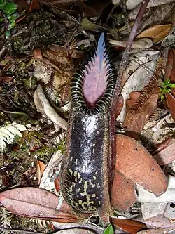 The pitcher lid or operculum is elliptic to ovate and measures up to 6 cm in length by 5 cm in width.[4] It is held roughly horizontally and often has upturned margins. The apex is rounded,[7] whereas the base is occasionally cordate[4] or subcordate.[7] No appendages are present on the lower surface, but multicellular filiform appendages may be found on the upper surface, though this feature is often unstable and may be absent altogether. These 'hairs' or 'tentacles' are up to 20 mm long and may be branched.[4] They arise from the ends of the lid veins and may number as many as 45 on each side of the lid. They are mainly restricted to the outer margins of the lid, where they are around 3 rows deep. The lower surface of the lid bears sparsely distributed nectar glands in the form of shortly elliptic, bordered pits. These are very small and inconspicuous, measuring only 0.1–0.2 mm in diameter.[7] A spur up to 9 mm long is inserted near the base of the lid. It may be simple or repeatedly branched[4] to the point of being fasciculate. The herbarium material examined by Cheek and Jebb exhibited spurs that were basally 5-branched, with each branch being secondarily ramified.[7]
