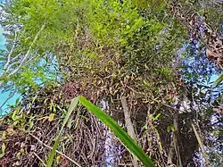 This species was compared to Nepenthes viridis with which it is morphologically most similar.[1][2] However, Nepenthes higaonon differs from N. viridis in having non-decurrent leaf-to-stem attachment, with the lamina having 3 veins on each side of the midrib, and rounded leaf apex, whereas in the latter the leaf-to-stem attachment is decurrent, with 1-2 veins on each side of the midrib, and with acute leaf apex.[1][2] The pitchers of N. higaonon is monomorphic, with the aerial pitchers cylindrical in the upper third, and the pitcher lid being flattened, ovate, angled by 90° exposing the pitcher opening as opposed to N. viridis having dimorphic pitchers, aerial pitchers infundibular in the upper third, and its pitcher lid domed, oval to cordate, and angled up to 60° partially covering the pitcher opening.[1][2] Other notable features of the species is the shallow depression in the anterior peristome of the aerial pitcher (raised in N. viridis), single-flowered inflorescence (vs. 2-flowered), and long climbing stems up to 10 meters (vs. up to 4 meters).[1][2]