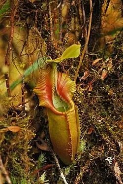 Rosette and lower pitchers are either infundibular in the lower third to half and ovoid above, or ovoid throughout. They reach 25 cm in height and 9 cm in width. A pair of fringed wings (≤15 mm wide) runs down the front of the pitcher. The glandular region covers the lower third to half of the inner surface. The glands are overarched and occur at a density of 400 to 1,300 per square centimetre.[2] The pitcher mouth is round and elongated into a wide neck. The peristome is flattened, expanded, and up to 40 mm wide. A series of teeth (≤7 mm wide) line its inner margin. The peristome ribs are spaced 0.5 to 1.5 mm apart. Pitchers bear 14 to 18 longitudinal nerves across their height.[2] The pitcher lid is ovate and usually has a hook-shaped appendage on the underside near the peristome. A branched spur (≤5 mm long) is inserted near the base of the lid.[8]