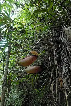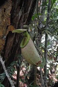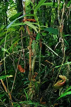 Nepenthes surigaoensis is a climbing plant growing to a height of 5 m.[6] The stem, which may be branched, is up to 1.25 cm in diameter and has internodes up to 14 cm long.[1][11] It often scrambles through vegetation, sometimes leaning against slanted tree trunks, but may also grow prostrate along the ground.[1] No infraspecific taxa of N. surigaoensis have been described.[6]