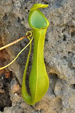 In the wild, both lower and upper pitchers are predominantly yellowish-green, even when growing exposed to direct sunlight, though in some plants the wing vestiges of the upper pitchers may be slightly reddish. The inner surface visible through the pitcher opening is near-white.[1]
